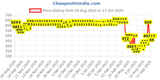 The current price is ₹497, which is ₹148 (42.4%) higher than the best price of ₹349 last seen on 3 Jul 2025. Over the 413 day price history period, prices have ranged from ₹349 to ₹659, with an average of ₹583. The pricing shows moderate volatility, and the overall trend is favorable for consumers as prices are getting cheaper. In terms of recent activity, there have been 0 price changes this week, 1 this month, and 106 over the past year. If you need this product now, it's a reasonable time to buy as prices are stable, but you might want to monitor for potential better deals.