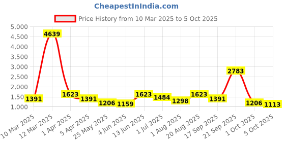 Good news! The current price of ₹1,113 is at its best ever level. Over the 209 day price history period, prices have ranged from ₹1,113 to ₹4,639, with an average of ₹1,709. The pricing shows high volatility with significant fluctuations, and the overall trend is favorable for consumers as prices are getting cheaper. In terms of recent activity, there have been 0 price changes this week, 2 this month, and 13 over the past year. This is an excellent time to make a purchase as prices are trending downward and conditions appear favorable.