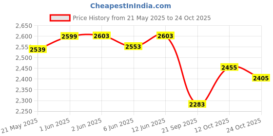 The current price is ₹2,405, which is ₹122 (5.3%) higher than the best price of ₹2,283 last seen on 21 Sep 2025. Over the 156 day price history period, prices have ranged from ₹2,283 to ₹2,603, with an average of ₹2,505. The pricing has been quite stable with low volatility, and the overall trend is favorable for consumers as prices are getting cheaper. In terms of recent activity, there have been 0 price changes this week, 1 this month, and 7 over the past year. The price direction is uncertain, so monitor the situation for a few more days before making a decision.