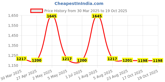 Fantastic! The current price of ₹1,198 is at its best ever level. Over the 201 day price history period, prices have ranged from ₹1,198 to ₹1,645, with an average of ₹1,304. The pricing shows moderate volatility, with prices remaining relatively stable overall. In terms of recent activity, there have been 0 price changes this week, 0 this month, and 8 over the past year. If you need this product now, it's a reasonable time to buy as prices are stable, but you might want to monitor for potential better deals.