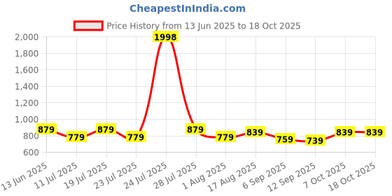 The current price is ₹839, which is ₹100 (13.5%) higher than the best price of ₹739 last seen on 12 Sep 2025. Over the 127 day price history period, prices have ranged from ₹739 to ₹1,998, with an average of ₹916. The pricing shows high volatility with significant fluctuations, with prices remaining relatively stable overall. In terms of recent activity, there have been 0 price changes this week, 0 this month, and 10 over the past year. If you need this product now, it's a reasonable time to buy as prices are stable, but you might want to monitor for potential better deals.