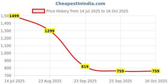 Exciting update! The current price of ₹759 is at its best ever level. Over the 94 day price history period, prices have ranged from ₹759 to ₹1,499, with an average of ₹1,027. The pricing shows high volatility with significant fluctuations, and the overall trend is favorable for consumers as prices are getting cheaper. In terms of recent activity, there have been 0 price changes this week, 1 this month, and 3 over the past year. If you need this product now, it's a reasonable time to buy as prices are stable, but you might want to monitor for potential better deals.