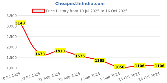 The current price is ₹1,106, which is ₹56 (5.3%) higher than the best price of ₹1,050 last seen on 9 Sep 2025. Over the 97 day price history period, prices have ranged from ₹1,050 to ₹3,149, with an average of ₹1,677. The pricing shows high volatility with significant fluctuations, and the overall trend is favorable for consumers as prices are getting cheaper. In terms of recent activity, there have been 0 price changes this week, 0 this month, and 6 over the past year. This is an excellent time to make a purchase as prices are trending downward and conditions appear favorable.