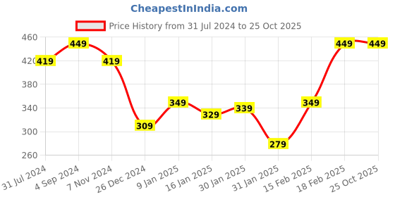 The current price is ₹449, which is ₹170 (60.9%) higher than the best price of ₹279 last seen on 31 Jan 2025. Over the 450 day price history period, prices have ranged from ₹279 to ₹449, with an average of ₹376. The pricing shows high volatility with significant fluctuations, but the overall trend is concerning as prices are getting more expensive. In terms of recent activity, there have been 0 price changes this week, 0 this month, and 7 over the past year. If you need this product now, it's a reasonable time to buy as prices are stable, but you might want to monitor for potential better deals.