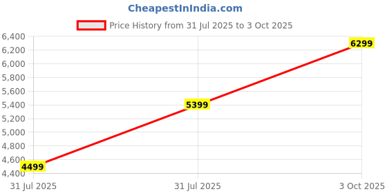 The current price is ₹6,299, which is ₹1,800 (40.0%) higher than the best price of ₹4,499 last seen on 31 Jul 2025. Over the 64 day price history period, prices have ranged from ₹4,499 to ₹6,299, with an average of ₹5,399. The pricing shows moderate volatility, but the overall trend is concerning as prices are getting more expensive. In terms of recent activity, there have been 0 price changes this week, 0 this month, and 2 over the past year. Consider waiting before making a purchase as prices are rising and better deals may be available later.