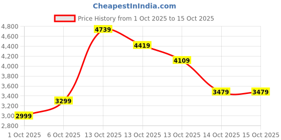The current price is ₹3,479, which is ₹480 (16.0%) higher than the best price of ₹2,999 last seen on 1 Oct 2025. Over the 13 day price history period, prices have ranged from ₹2,999 to ₹4,739, with an average of ₹3,789. The pricing shows high volatility with significant fluctuations, but the overall trend is concerning as prices are getting more expensive. In terms of recent activity, there have been 3 price changes this week, 5 this month, and 5 over the past year. The price direction is uncertain, so monitor the situation for a few more days before making a decision.