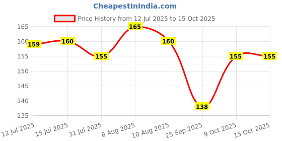 The current price is ₹155, which is ₹17 (12.3%) higher than the best price of ₹138 last seen on 25 Sep 2025. Over the 94 day price history period, prices have ranged from ₹138 to ₹165, with an average of ₹156. The pricing has been quite stable with low volatility, with prices remaining relatively stable overall. In terms of recent activity, there have been 0 price changes this week, 1 this month, and 6 over the past year. If you need this product now, it's a reasonable time to buy as prices are stable, but you might want to monitor for potential better deals.