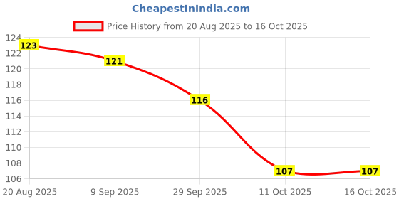 Great news for shoppers! The current price of ₹107 is at its best ever level. Over the 57 day price history period, prices have ranged from ₹107 to ₹123, with an average of ₹115. The pricing shows moderate volatility, and the overall trend is favorable for consumers as prices are getting cheaper. In terms of recent activity, there have been 0 price changes this week, 1 this month, and 3 over the past year. If you need this product now, it's a reasonable time to buy as prices are stable, but you might want to monitor for potential better deals.