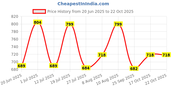 The current price is ₹718, which is ₹36 (5.3%) higher than the best price of ₹682 last seen on 25 Sep 2025. Over the 123 day price history period, prices have ranged from ₹682 to ₹804, with an average of ₹730. The pricing shows moderate volatility, with prices remaining relatively stable overall. In terms of recent activity, there have been 0 price changes this week, 1 this month, and 8 over the past year. If you need this product now, it's a reasonable time to buy as prices are stable, but you might want to monitor for potential better deals.