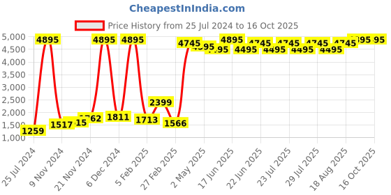The current price is ₹4,895, which is ₹3,636 (288.8%) higher than the best price of ₹1,259 last seen on 25 Jul 2024. Over the 447 day price history period, prices have ranged from ₹1,259 to ₹4,895, with an average of ₹3,752. The pricing shows high volatility with significant fluctuations, but the overall trend is concerning as prices are getting more expensive. In terms of recent activity, there have been 0 price changes this week, 0 this month, and 21 over the past year. Consider waiting before making a purchase as prices are rising and better deals may be available later.