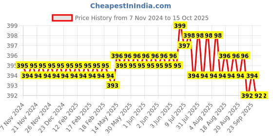 Awesome! The current price of ₹392 is at its best ever level. Over the 342 day price history period, prices have ranged from ₹392 to ₹399, with an average of ₹395. The pricing has been quite stable with low volatility, with prices remaining relatively stable overall. In terms of recent activity, there have been 0 price changes this week, 1 this month, and 52 over the past year. If you need this product now, it's a reasonable time to buy as prices are stable, but you might want to monitor for potential better deals.