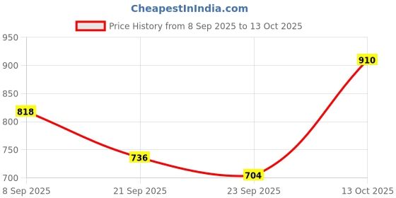 The current price is ₹910, which is ₹206 (29.3%) higher than the best price of ₹704 last seen on 23 Sep 2025. Over the 35 day price history period, prices have ranged from ₹704 to ₹910, with an average of ₹792. The pricing shows moderate volatility, but the overall trend is concerning as prices are getting more expensive. In terms of recent activity, there have been 0 price changes this week, 2 this month, and 3 over the past year. Consider waiting before making a purchase as prices are rising and better deals may be available later.