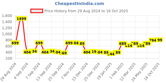 The current price is ₹799, which is ₹455 (132.3%) higher than the best price of ₹344 last seen on 19 Jan 2025. Over the 413 day price history period, prices have ranged from ₹344 to ₹1,499, with an average of ₹587. The pricing shows high volatility with significant fluctuations, but the overall trend is concerning as prices are getting more expensive. In terms of recent activity, there have been 0 price changes this week, 0 this month, and 15 over the past year. Consider waiting before making a purchase as prices are rising and better deals may be available later.