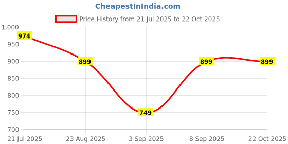 The current price is ₹899, which is ₹150 (20.0%) higher than the best price of ₹749 last seen on 3 Sep 2025. Over the 92 day price history period, prices have ranged from ₹749 to ₹974, with an average of ₹884. The pricing shows moderate volatility, and the overall trend is favorable for consumers as prices are getting cheaper. In terms of recent activity, there have been 0 price changes this week, 0 this month, and 3 over the past year. The price direction is uncertain, so monitor the situation for a few more days before making a decision.