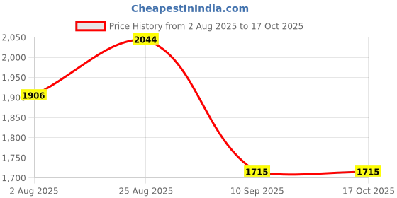 Good news! The current price of ₹1,715 is at its best ever level. Over the 75 day price history period, prices have ranged from ₹1,715 to ₹2,044, with an average of ₹1,845. The pricing shows moderate volatility, and the overall trend is favorable for consumers as prices are getting cheaper. In terms of recent activity, there have been 0 price changes this week, 0 this month, and 2 over the past year. This is an excellent time to make a purchase as prices are trending downward and conditions appear favorable.