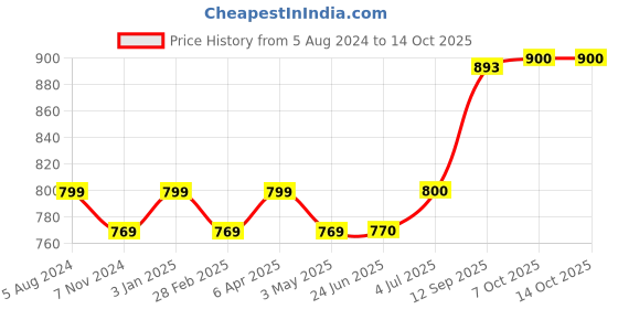 The current price is ₹900, which is ₹130.77 (17.0%) higher than the best price of ₹769.23 last seen on 7 Nov 2024. Over the 434 day price history period, prices have ranged from ₹769.23 to ₹900, with an average of ₹815. The pricing shows moderate volatility, but the overall trend is concerning as prices are getting more expensive. In terms of recent activity, there have been 0 price changes this week, 0 this month, and 8 over the past year. If you need this product now, it's a reasonable time to buy as prices are stable, but you might want to monitor for potential better deals.