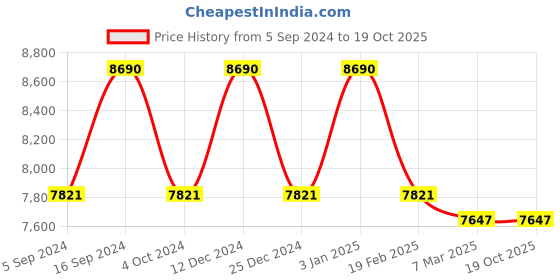 Fantastic! The current price of ₹7,647 is at its best ever level. Over the 408 day price history period, prices have ranged from ₹7,647 to ₹8,690, with an average of ₹8,072. The pricing shows moderate volatility, with prices remaining relatively stable overall. In terms of recent activity, there have been 0 price changes this week, 0 this month, and 4 over the past year. The price direction is uncertain, so monitor the situation for a few more days before making a decision.