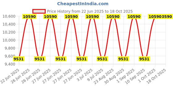 The current price is ₹10,590, which is ₹1,059 (11.1%) higher than the best price of ₹9,531 last seen on 22 Jun 2025. Over the 118 day price history period, prices have ranged from ₹9,531 to ₹10,590, with an average of ₹10,096. The pricing shows moderate volatility, but the overall trend is concerning as prices are getting more expensive. In terms of recent activity, there have been 0 price changes this week, 0 this month, and 13 over the past year. Consider waiting before making a purchase as prices are rising and better deals may be available later.