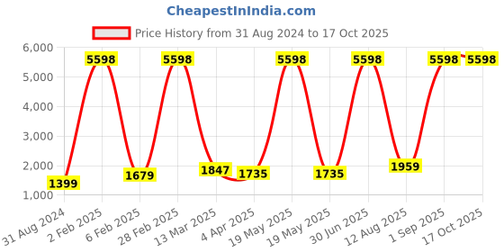 The current price is ₹5,598, which is ₹4,199 (300.1%) higher than the best price of ₹1,399 last seen on 31 Aug 2024. Over the 411 day price history period, prices have ranged from ₹1,399 to ₹5,598, with an average of ₹3,662. The pricing shows high volatility with significant fluctuations, but the overall trend is concerning as prices are getting more expensive. In terms of recent activity, there have been 0 price changes this week, 0 this month, and 9 over the past year. Consider waiting before making a purchase as prices are rising and better deals may be available later.