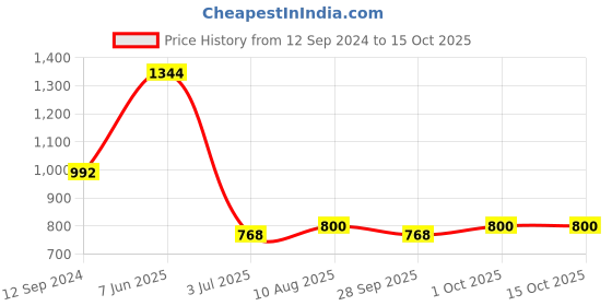 The current price is ₹800, which is ₹32 (4.2%) higher than the best price of ₹768 last seen on 3 Jul 2025. Over the 398 day price history period, prices have ranged from ₹768 to ₹1,344, with an average of ₹896. The pricing shows high volatility with significant fluctuations, and the overall trend is favorable for consumers as prices are getting cheaper. In terms of recent activity, there have been 0 price changes this week, 1 this month, and 4 over the past year. If you need this product now, it's a reasonable time to buy as prices are stable, but you might want to monitor for potential better deals.