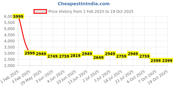 Fantastic! The current price of ₹2,399 is at its best ever level. Over the 259 day price history period, prices have ranged from ₹2,399 to ₹5,999, with an average of ₹3,006. The pricing shows high volatility with significant fluctuations, and the overall trend is favorable for consumers as prices are getting cheaper. In terms of recent activity, there have been 0 price changes this week, 1 this month, and 12 over the past year. This is an excellent time to make a purchase as prices are trending downward and conditions appear favorable.