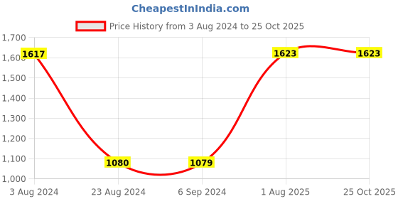 The current price is ₹1,623, which is ₹543.2 (50.3%) higher than the best price of ₹1,079.8 last seen on 6 Sep 2024. Over the 447 day price history period, prices have ranged from ₹1,079.8 to ₹1,623, with an average of ₹1,405. The pricing shows high volatility with significant fluctuations, with prices remaining relatively stable overall. In terms of recent activity, there have been 0 price changes this week, 0 this month, and 0 over the past year. The price direction is uncertain, so monitor the situation for a few more days before making a decision.