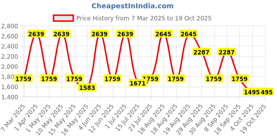 Great news for shoppers! The current price of ₹1,495 is at its best ever level. Over the 225 day price history period, prices have ranged from ₹1,495 to ₹2,645, with an average of ₹2,037. The pricing shows high volatility with significant fluctuations, and the overall trend is favorable for consumers as prices are getting cheaper. In terms of recent activity, there have been 0 price changes this week, 0 this month, and 18 over the past year. This is an excellent time to make a purchase as prices are trending downward and conditions appear favorable.
