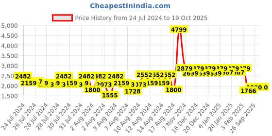 The current price is ₹1,920, which is ₹365 (23.5%) higher than the best price of ₹1,555 last seen on 2 Aug 2024. Over the 451 day price history period, prices have ranged from ₹1,555 to ₹4,799, with an average of ₹2,377. The pricing shows high volatility with significant fluctuations, and the overall trend is favorable for consumers as prices are getting cheaper. In terms of recent activity, there have been 0 price changes this week, 0 this month, and 12 over the past year. The price direction is uncertain, so monitor the situation for a few more days before making a decision.