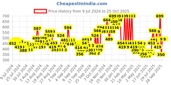 The current price is ₹489, which is ₹150 (44.2%) higher than the best price of ₹339 last seen on 13 Jun 2025. Over the 472 day price history period, prices have ranged from ₹339 to ₹699, with an average of ₹474. The pricing shows high volatility with significant fluctuations, but the overall trend is concerning as prices are getting more expensive. In terms of recent activity, there have been 0 price changes this week, 1 this month, and 54 over the past year. Consider waiting before making a purchase as prices are rising and better deals may be available later.