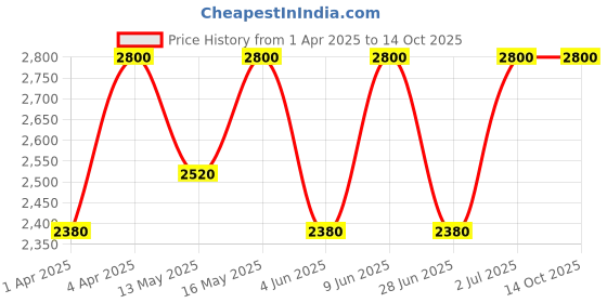 The current price is ₹2,800, which is ₹420 (17.6%) higher than the best price of ₹2,380 last seen on 1 Apr 2025. Over the 195 day price history period, prices have ranged from ₹2,380 to ₹2,800, with an average of ₹2,629. The pricing shows moderate volatility, but the overall trend is concerning as prices are getting more expensive. In terms of recent activity, there have been 0 price changes this week, 0 this month, and 7 over the past year. Consider waiting before making a purchase as prices are rising and better deals may be available later.