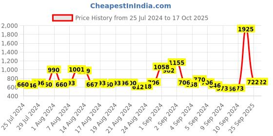 The current price is ₹722, which is ₹156 (27.6%) higher than the best price of ₹566 last seen on 10 Sep 2024. Over the 448 day price history period, prices have ranged from ₹566 to ₹1,925, with an average of ₹774. The pricing shows high volatility with significant fluctuations, but the overall trend is concerning as prices are getting more expensive. In terms of recent activity, there have been 0 price changes this week, 0 this month, and 0 over the past year. The price direction is uncertain, so monitor the situation for a few more days before making a decision.