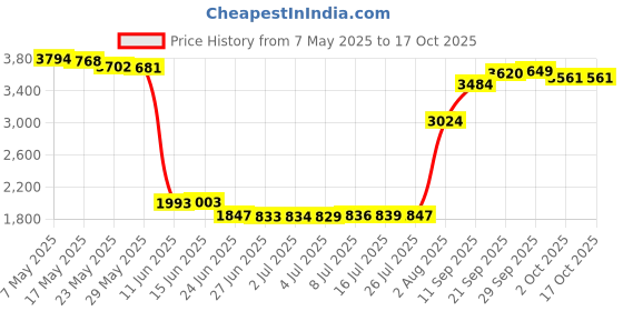The current price is ₹3,561, which is ₹1,732 (94.7%) higher than the best price of ₹1,829 last seen on 4 Jul 2025. Over the 162 day price history period, prices have ranged from ₹1,829 to ₹3,794, with an average of ₹2,774. The pricing shows high volatility with significant fluctuations, and the overall trend is favorable for consumers as prices are getting cheaper. In terms of recent activity, there have been 0 price changes this week, 2 this month, and 17 over the past year. If you need this product now, it's a reasonable time to buy as prices are stable, but you might want to monitor for potential better deals.