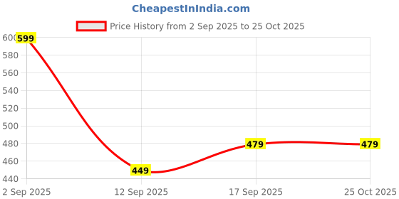 The current price is ₹479, which is ₹30 (6.7%) higher than the best price of ₹449 last seen on 12 Sep 2025. Over the 52 day price history period, prices have ranged from ₹449 to ₹599, with an average of ₹502. The pricing shows moderate volatility, and the overall trend is favorable for consumers as prices are getting cheaper. In terms of recent activity, there have been 0 price changes this week, 0 this month, and 2 over the past year. If you need this product now, it's a reasonable time to buy as prices are stable, but you might want to monitor for potential better deals.
