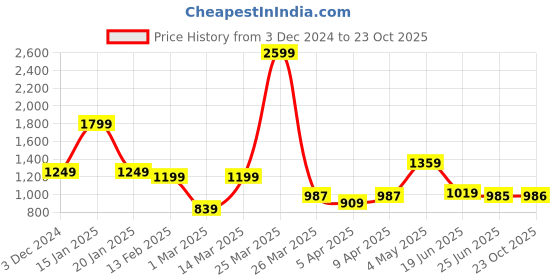 The current price is ₹986, which is ₹147 (17.5%) higher than the best price of ₹839 last seen on 1 Mar 2025. Over the 324 day price history period, prices have ranged from ₹839 to ₹2,599, with an average of ₹1,240. The pricing shows high volatility with significant fluctuations, and the overall trend is favorable for consumers as prices are getting cheaper. In terms of recent activity, there have been 0 price changes this week, 0 this month, and 13 over the past year. If you need this product now, it's a reasonable time to buy as prices are stable, but you might want to monitor for potential better deals.