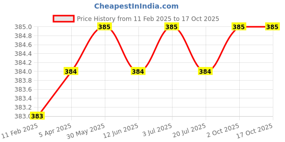 The current price is ₹385, which is ₹1.03 (0.3%) higher than the best price of ₹383.97 last seen on 11 Feb 2025. Over the 247 day price history period, prices have ranged from ₹383.97 to ₹385, with an average of ₹385. The pricing has been quite stable with low volatility, with prices remaining relatively stable overall. In terms of recent activity, there have been 0 price changes this week, 0 this month, and 6 over the past year. If you need this product now, it's a reasonable time to buy as prices are stable, but you might want to monitor for potential better deals.
