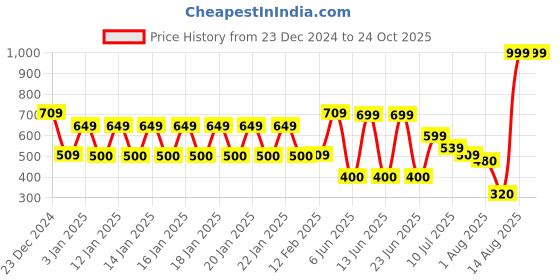 The current price is ₹999, which is ₹679 (212.2%) higher than the best price of ₹320 last seen on 10 Aug 2025. Over the 305 day price history period, prices have ranged from ₹320 to ₹999, with an average of ₹584. The pricing shows high volatility with significant fluctuations, but the overall trend is concerning as prices are getting more expensive. In terms of recent activity, there have been 0 price changes this week, 0 this month, and 28 over the past year. Consider waiting before making a purchase as prices are rising and better deals may be available later.