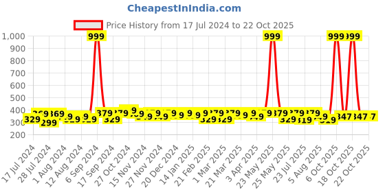 The current price is ₹347, which is ₹48 (16.1%) higher than the best price of ₹299 last seen on 28 Jul 2024. Over the 461 day price history period, prices have ranged from ₹299 to ₹999, with an average of ₹416. The pricing shows high volatility with significant fluctuations, but the overall trend is concerning as prices are getting more expensive. In terms of recent activity, there has been 1 price change this week, 3 this month, and 29 over the past year. The price direction is uncertain, so monitor the situation for a few more days before making a decision.