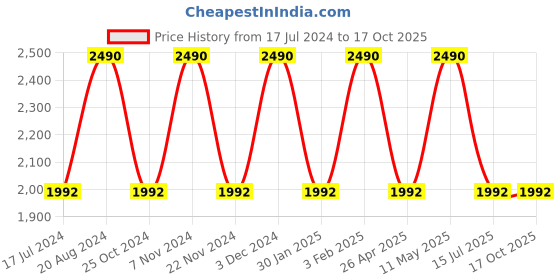 Good news! The current price of ₹1,992 is at its best ever level. Over the 456 day price history period, prices have ranged from ₹1,992 to ₹2,490, with an average of ₹2,200. The pricing shows moderate volatility, with prices remaining relatively stable overall. In terms of recent activity, there have been 0 price changes this week, 0 this month, and 8 over the past year. The price direction is uncertain, so monitor the situation for a few more days before making a decision.