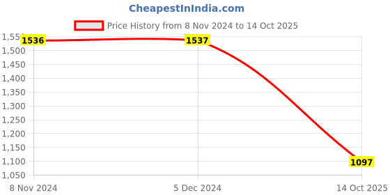Good news! The current price of ₹1,097 is at its best ever level. Over the 340 day price history period, prices have ranged from ₹1,097 to ₹1,537, with an average of ₹1,390. The pricing shows moderate volatility, and the overall trend is favorable for consumers as prices are getting cheaper. In terms of recent activity, there have been 0 price changes this week, 0 this month, and 2 over the past year. This is an excellent time to make a purchase as prices are trending downward and conditions appear favorable.