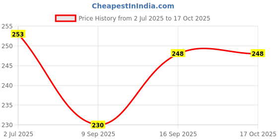 The current price is ₹248, which is ₹18 (7.8%) higher than the best price of ₹230 last seen on 9 Sep 2025. Over the 106 day price history period, prices have ranged from ₹230 to ₹253, with an average of ₹245. The pricing has been quite stable with low volatility, with prices remaining relatively stable overall. In terms of recent activity, there have been 0 price changes this week, 0 this month, and 2 over the past year. If you need this product now, it's a reasonable time to buy as prices are stable, but you might want to monitor for potential better deals.