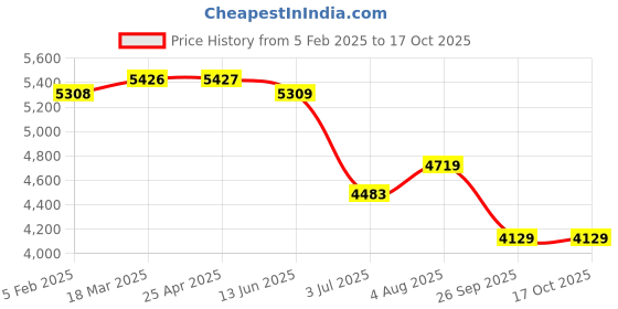 Fantastic! The current price of ₹4,129 is at its best ever level. Over the 253 day price history period, prices have ranged from ₹4,129 to ₹5,427, with an average of ₹4,866. The pricing shows moderate volatility, and the overall trend is favorable for consumers as prices are getting cheaper. In terms of recent activity, there have been 0 price changes this week, 0 this month, and 6 over the past year. This is an excellent time to make a purchase as prices are trending downward and conditions appear favorable.
