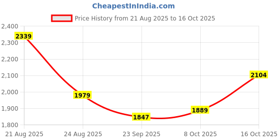 The current price is ₹1,889, which is ₹42 (2.3%) higher than the best price of ₹1,847 last seen on 23 Sep 2025. Over the 56 day price history period, prices have ranged from ₹1,847 to ₹2,339, with an average of ₹1,989. The pricing shows moderate volatility, and the overall trend is favorable for consumers as prices are getting cheaper. In terms of recent activity, there have been 0 price changes this week, 1 this month, and 3 over the past year. If you need this product now, it's a reasonable time to buy as prices are stable, but you might want to monitor for potential better deals.