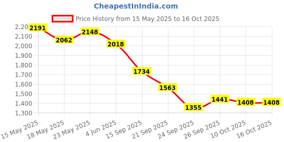The current price is ₹1,408, which is ₹53 (3.9%) higher than the best price of ₹1,355 last seen on 24 Sep 2025. Over the 154 day price history period, prices have ranged from ₹1,355 to ₹2,191, with an average of ₹1,733. The pricing shows high volatility with significant fluctuations, and the overall trend is favorable for consumers as prices are getting cheaper. In terms of recent activity, there have been 0 price changes this week, 3 this month, and 8 over the past year. If you need this product now, it's a reasonable time to buy as prices are stable, but you might want to monitor for potential better deals.