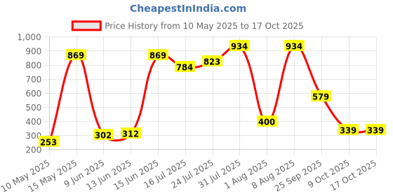 The current price is ₹339, which is ₹86 (34.0%) higher than the best price of ₹253 last seen on 10 May 2025. Over the 159 day price history period, prices have ranged from ₹253 to ₹934, with an average of ₹595. The pricing shows high volatility with significant fluctuations, but the overall trend is concerning as prices are getting more expensive. In terms of recent activity, there have been 0 price changes this week, 1 this month, and 11 over the past year. The price direction is uncertain, so monitor the situation for a few more days before making a decision.