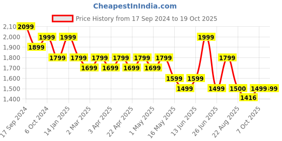 The current price is ₹1,499, which is ₹83 (5.9%) higher than the best price of ₹1,416 last seen on 22 Sep 2025. Over the 396 day price history period, prices have ranged from ₹1,416 to ₹2,099, with an average of ₹1,729. The pricing shows moderate volatility, and the overall trend is favorable for consumers as prices are getting cheaper. In terms of recent activity, there have been 0 price changes this week, 1 this month, and 19 over the past year. If you need this product now, it's a reasonable time to buy as prices are stable, but you might want to monitor for potential better deals.