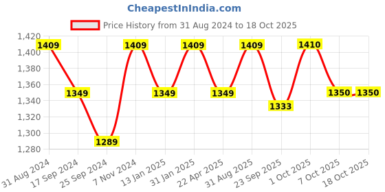 The current price is ₹1,350, which is ₹61 (4.7%) higher than the best price of ₹1,289 last seen on 25 Sep 2024. Over the 413 day price history period, prices have ranged from ₹1,289 to ₹1,410, with an average of ₹1,368. The pricing has been quite stable with low volatility, with prices remaining relatively stable overall. In terms of recent activity, there have been 0 price changes this week, 2 this month, and 7 over the past year. If you need this product now, it's a reasonable time to buy as prices are stable, but you might want to monitor for potential better deals.