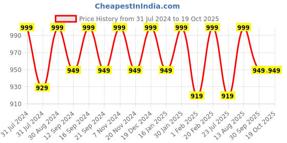 The current price is ₹949.05, which is ₹29.97 (3.3%) higher than the best price of ₹919.08 last seen on 1 Feb 2025. Over the 444 day price history period, prices have ranged from ₹919.08 to ₹999, with an average of ₹968. The pricing has been quite stable with low volatility, and the overall trend is favorable for consumers as prices are getting cheaper. In terms of recent activity, there have been 0 price changes this week, 0 this month, and 9 over the past year. If you need this product now, it's a reasonable time to buy as prices are stable, but you might want to monitor for potential better deals.