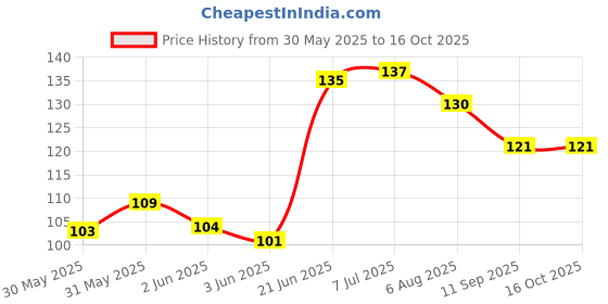 The current price is ₹121, which is ₹20 (19.8%) higher than the best price of ₹101 last seen on 3 Jun 2025. Over the 139 day price history period, prices have ranged from ₹101 to ₹137, with an average of ₹118. The pricing shows moderate volatility, but the overall trend is concerning as prices are getting more expensive. In terms of recent activity, there have been 0 price changes this week, 0 this month, and 7 over the past year. If you need this product now, it's a reasonable time to buy as prices are stable, but you might want to monitor for potential better deals.