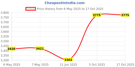 The current price is ₹3,775, which is ₹472 (14.3%) higher than the best price of ₹3,303 last seen on 11 Jun 2025. Over the 163 day price history period, prices have ranged from ₹3,303 to ₹3,775, with an average of ₹3,539. The pricing shows moderate volatility, but the overall trend is concerning as prices are getting more expensive. In terms of recent activity, there have been 0 price changes this week, 0 this month, and 3 over the past year. Consider waiting before making a purchase as prices are rising and better deals may be available later.