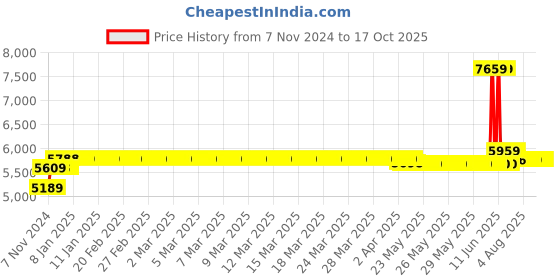 The current price is ₹5,769, which is ₹580 (11.2%) higher than the best price of ₹5,189 last seen on 7 Nov 2024. Over the 343 day price history period, prices have ranged from ₹5,189 to ₹7,659, with an average of ₹5,787. The pricing has been quite stable with low volatility, but the overall trend is concerning as prices are getting more expensive. In terms of recent activity, there have been 0 price changes this week, 0 this month, and 155 over the past year. If you need this product now, it's a reasonable time to buy as prices are stable, but you might want to monitor for potential better deals.